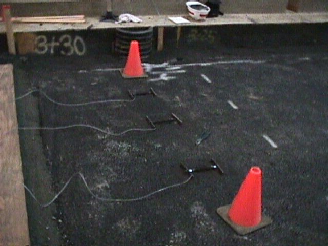 ASGs were installed in both longitudinal and transverse directions at the bottom of the surface asphalt layer and at the bottom of the stabilized base asphalt layer of the stabilized base test items. The figure below shows the installation of ASG in the AC layer. A total of 96 H-bar type ASGs (transverse and longitudinal) were installed at the time of construction. The location of the ASGs in flexible test itemns are presented by CTL (1998).