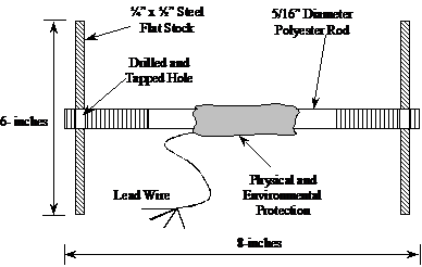 The exposure to the high temperature accompanying rolling and vibratory impacts during and after installation reduces the survival rate of these gauges, making it difficult to install these sensors. To ensure a high survival rate, manufacturers developed a robust sensor combined with installation procedures that increased gauge survival rates (Weinmann et al. 2004). The ASGs were fabricated by CTL and were applied on 0.31 inches (0.79 cm) diameter and 8 inches (20.3 cm) long polyester bars at mid length between end flanges. A schematic showing details of the principal features of the design and construction of the ASGs is shown in the figure below (Garg and Hayhoe 2001). According to manufacturer specifications, the ASG instrument had an accuracy of 1 microstrain and a resolution of 0.1 microstrain. The measurement range was 2000 microstrain and the temperature range was from 0 to 150°C.