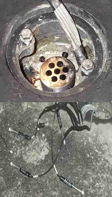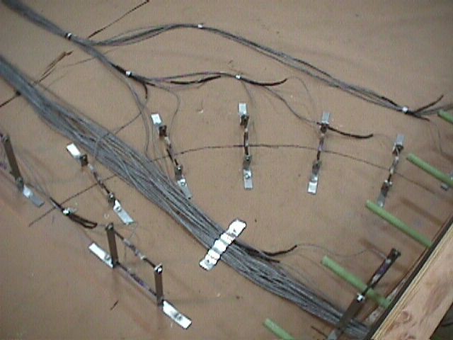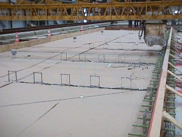 CSGs were of the same basic design as the ASGs, except that the foil gauges were affixed to 0.31 inch diameter (0.79 cm) and 8 inch long (20.3 cm) steel bars. Only slabs 2 and 3 in each lane were instrumented. Sensors were installed near both the top and bottom surfaces of the slabs to provide measurements of the tensile and the compressive strains that developed during loading. The photos below show the installation of CSGs in the NAPTF rigid pavement test items. A total of 154 concrete strain gauges were installed in test items LRS, MRS, and HRS. From the total of 154 concrete strain gauges, 40 were found to be not performing, including 14 sensors (9.1%) in LRS, 12 sensors (7.7%) in MRS and 14 sensors (9.1%) in HRS (Guo, Hayhoe et al. 2002) The details about the location of the sensors are documented by Guo, Hayhoe et al. (2002).