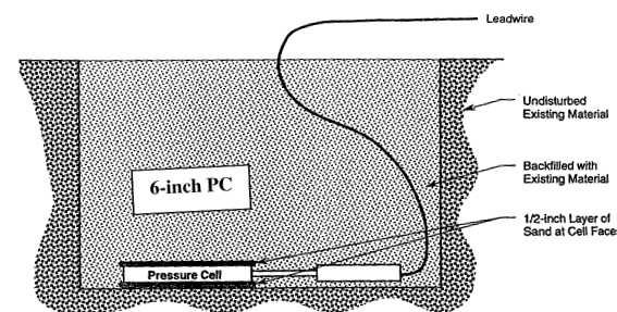 A total of 60 PC6 and 84 PC2 pressure cells were installed to measure pressures. The PC2 were Kulite Model Soil Pressure Cells. They were small diameter soil pressure cells consisting of a liquid-filled hollow steel cell of approximately 2 inches (5.1 cm) in diameter and 0.5 inches (1.3 cm) thick with an electrical pressure transducer housed within the cell. The PC6 were Geokon Model Earth Pressure Cells. They were large diameter soil pressure cells consisting of two welded steel plates of 6 inches (15.3 cm) diameter and 0.5 inches (1.3 cm) thick. The space between the two plates were filled with liquid connected to an electrical pressure transducer with a steel tube. Any change in the soil pressure where the cell was embedded, was measured by pressure transducer (CTL 1998). The PC6 sensors were installed in the unbound granular base and subbase and the PC2 sensors were installed in the subgrade. All the pressure cells were located near the west side MDDs. The 6-inch pressure cell is displayed in the figure below.