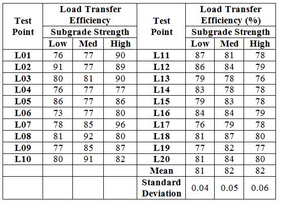 The tables below show the calculated Joint load transfer efficiency (LTEδ), values for longitudinal and transverse joints, based on the 24 kip drops.