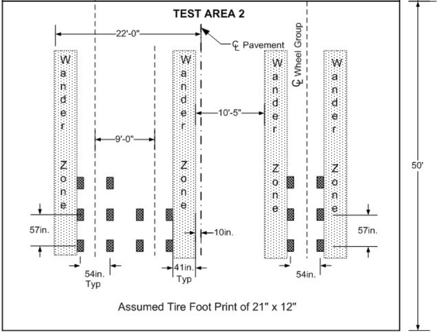 Two landing gear configurations were used for trafficking the test items; a 6-wheel landing gear and a 10-wheel landing gear. Figure below presents Test Area 1. A pavement centerline that divides the test items into north and south sections is shown. The Figure presents the wheels configurations of sections loaded with 10- and 6-wheel gears on different sides. The Figure also depicts wander zones for each group of wheels. The wander zone of the 10-wheel gear extends on both sides of the centerline in Test Area 1 configuration. In Test Area 2 configuration, however, the 10-wheel gear is contained on one side of the pavement centerline and wander zone stops 10 inches from the centerline as shown.