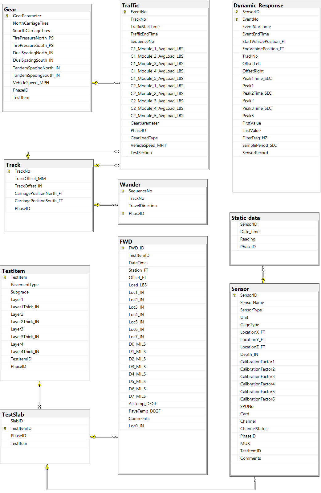 Dynamic sensors are triggered by movements of the load vehicle. Therefore, dynamic sensor responses are collected only on days when the load vehicle is in operation. Dynamic sensor records are available for most passes of the load vehicle on the test items. However, some gaps in the data are known to exist. Click on the Dynamic Sensor Data link below to search the database for a particular dynamic sensor.