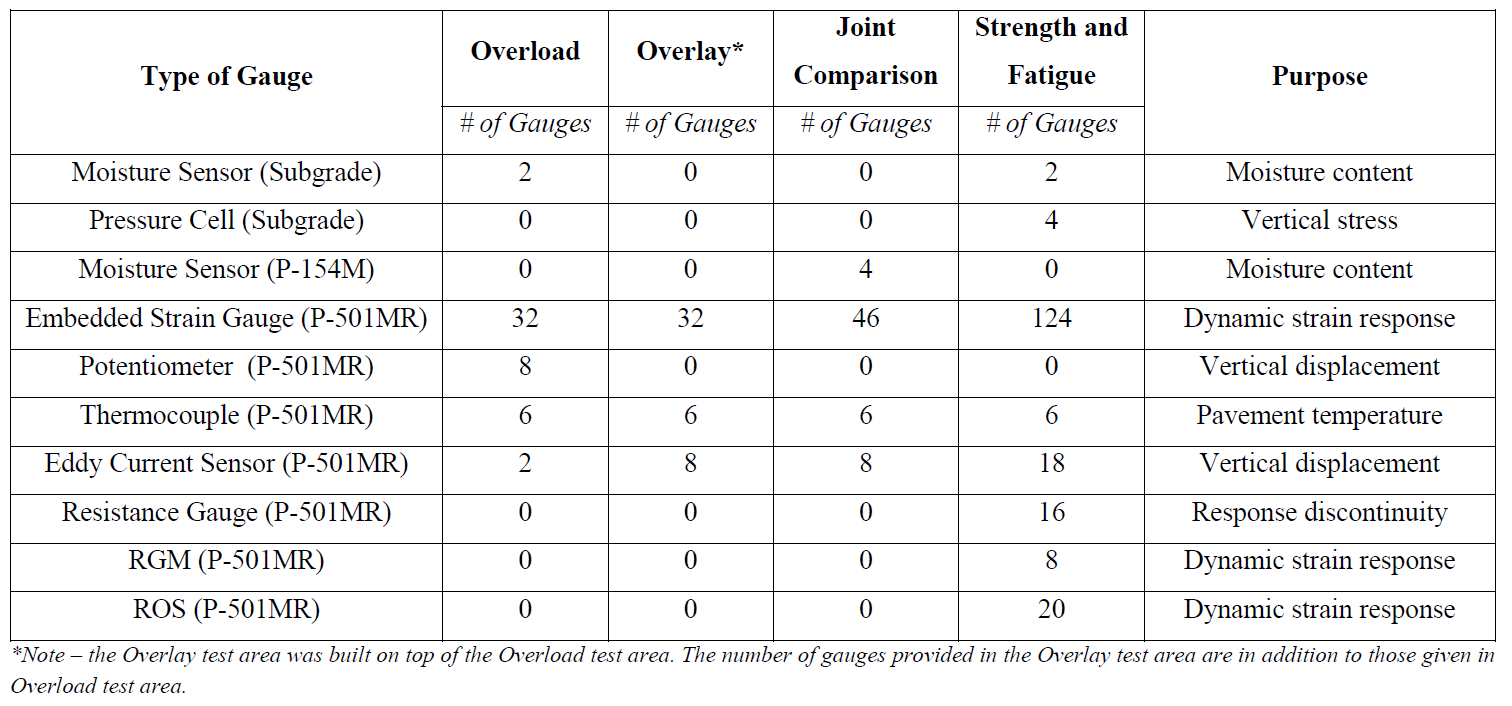 Instrumentation was placed in the P-152M subgrade, P-154M subbase, and P-501MR Portland Cement Concrete (PCC) surface layers. Moisture sensors (placed in the P-152M and P-154M layers) and pressure cells (placed in the P-152M layer) were the only sensors placed in the subgrade and subbase layers. Instrumentation within P-501MR was selected and installed to monitor vertical movement of the test slabs and measure strain responses at the top and bottom of the slab. The gauge selection was based on reliability, accuracy, and ease of handling at the construction site. The types and quantity of each gauge in addition to the sections they were placed in are presented in the table below.