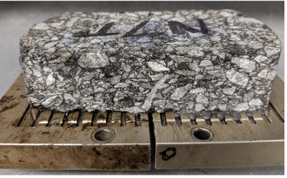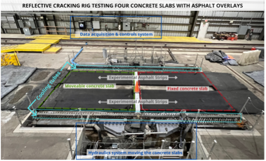 To convey the significance of the Reflective Cracking Rig, it is necessary to explain the scale and parameters of its function. A helpful starting point is the Texas Overlay Tester, a small-scale laboratory instrument that measures approximately 5.0 inches by 7.4 inches (12.7 cm by 18.8 cm). The Texas Overlay Tester mimics the movement of a concrete slab at the bottom of a hot mix asphalt layer, and subsequent crack growth through the asphalt, allowing researchers to evaluate the performance of asphalt mixtures.